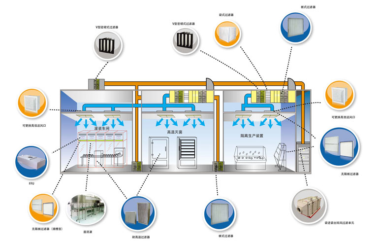 “民以食為天”,當(dāng)今社會,人們對食品衛(wèi)生越來越關(guān)注。在食品生產(chǎn)領(lǐng)域,嚴(yán)格要求生產(chǎn)設(shè)施必須有效避免任何潛在污染風(fēng)險。經(jīng)過HEPA空氣過濾器后,食品行業(yè)加工環(huán)境(ISO8級或ISO9級)對細(xì)菌和顆粒物的有效控制起到顯著效果。食品灌裝線,如飲料、酸奶、啤酒,更要達(dá)到ISO5級或ISO6級要求。在不添加防腐劑的前提下,能保證食品的顏色,味道和其它感官品質(zhì),從而大大延長食品的保質(zhì)期。